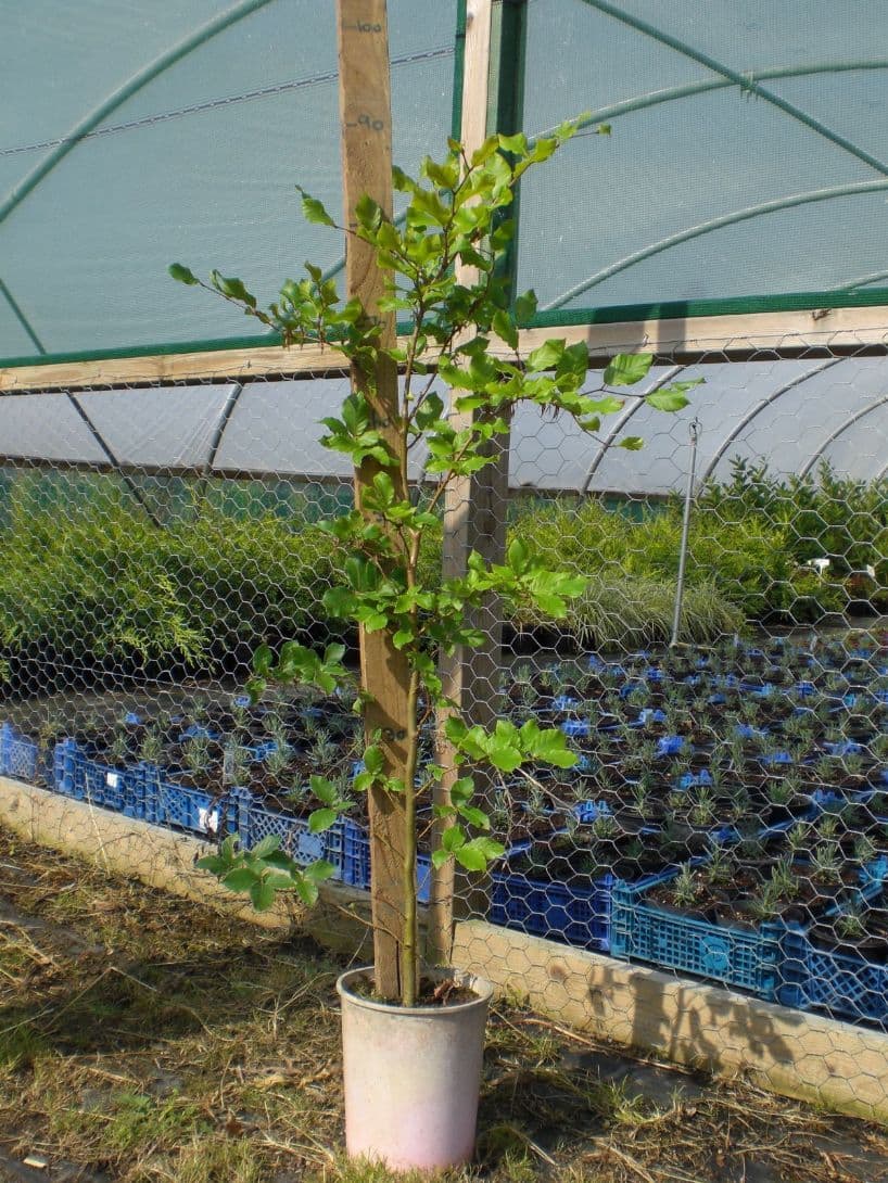 Fagus sylvatica - Green Beech is a native plant which needs space as it grows to form a tall wide spreading tree. The young leaves are light green turning to a cooper colour in the autumn. Needs a well drained soil and will grow well on chalky soils. Mostly used for hedging and will form an excellent hedge.