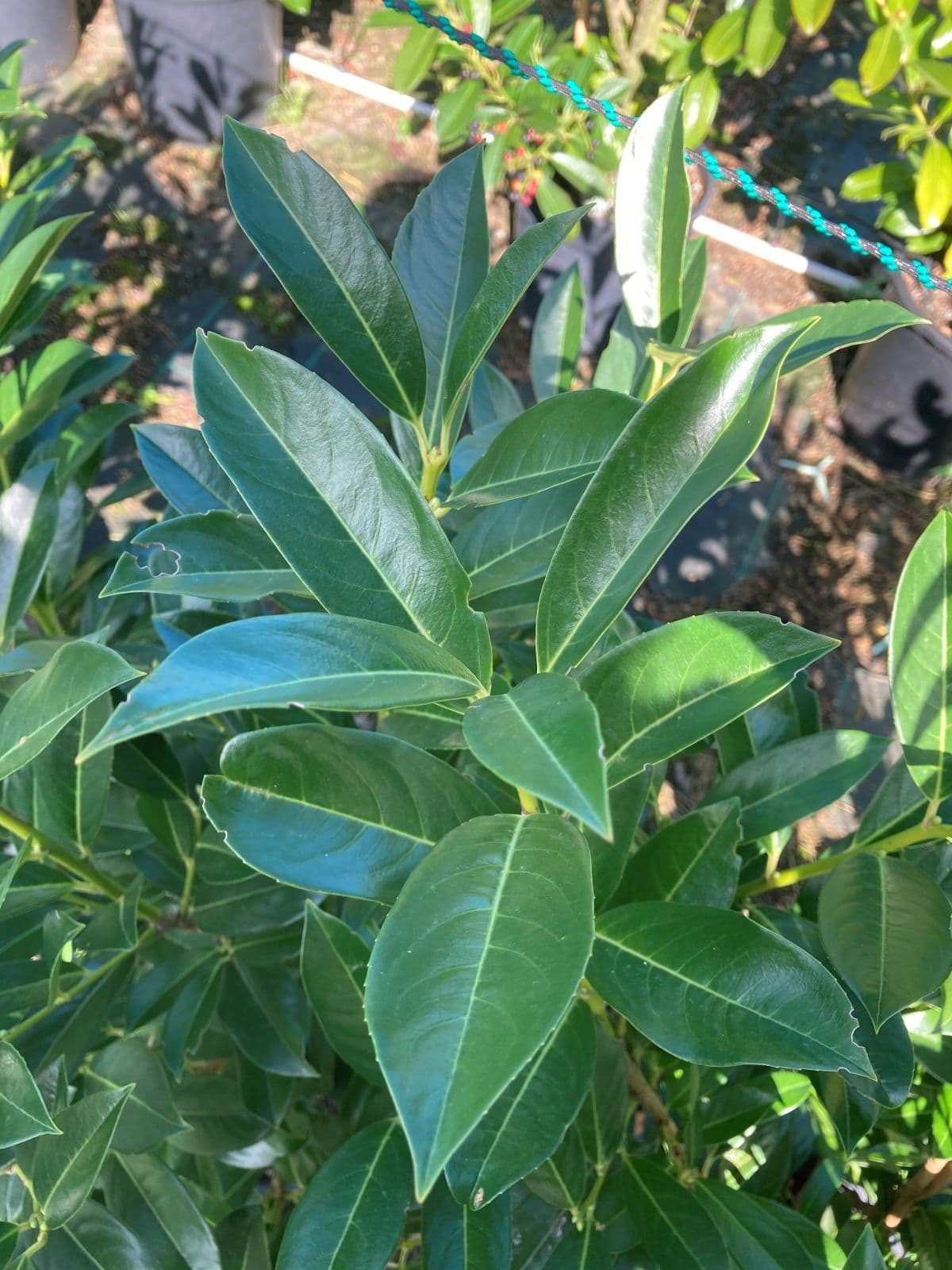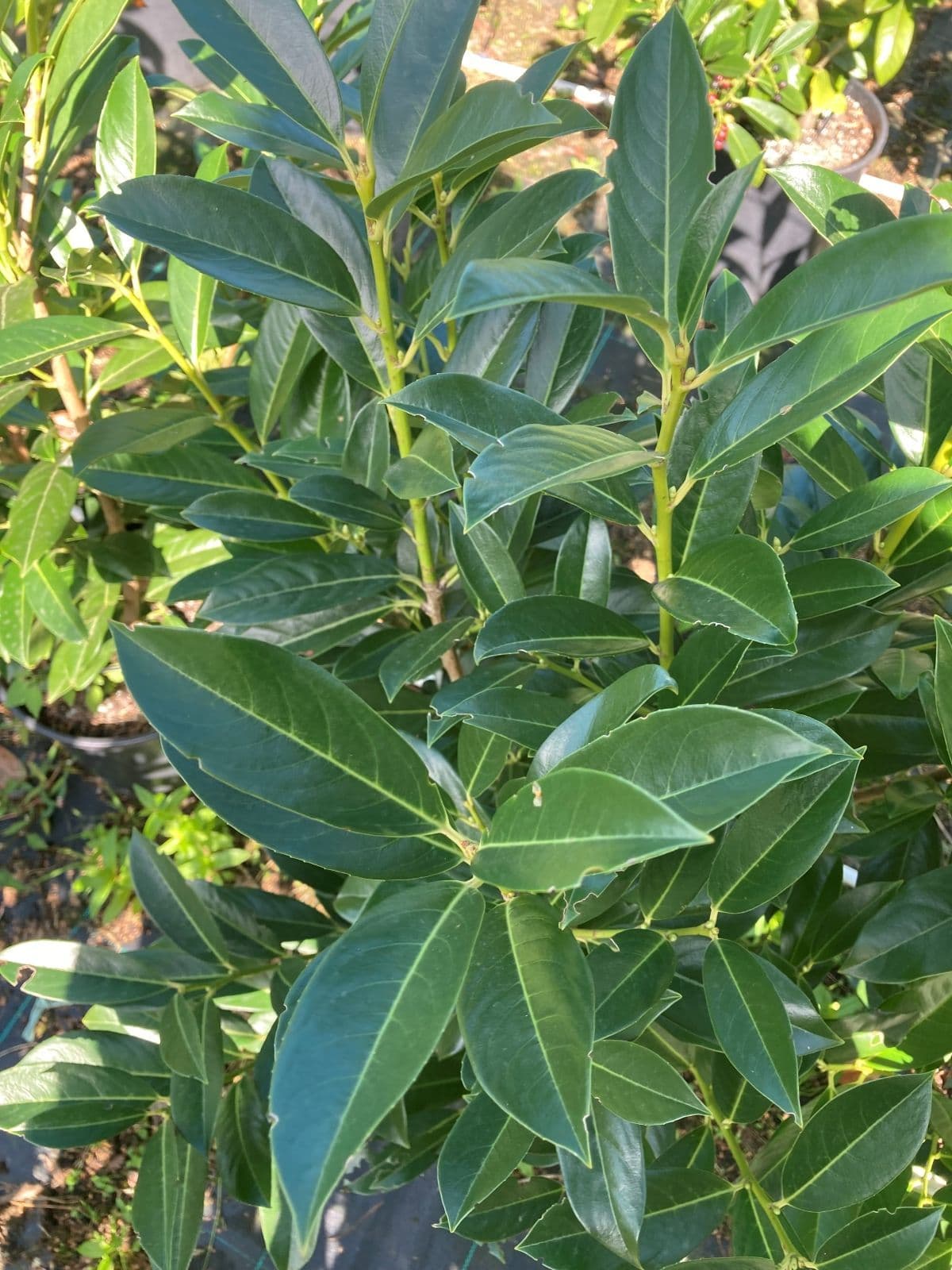 Prunus laurocerasus Elly Cherry Laurel Elly or Common Laurel Elly is a dense, slender, upright evergreen shrub with long glossy green leaves. Produces spikes of white flowers in spring. Will grow to up to 4 metres tall with a spread of up to 0.8 to 1 metre. Needs much less trimming than Rotundifolia. Makes an excellent hedge to be trimmed to between 1.5 - 4 metres tall. Good in shady positions. Very hardy.