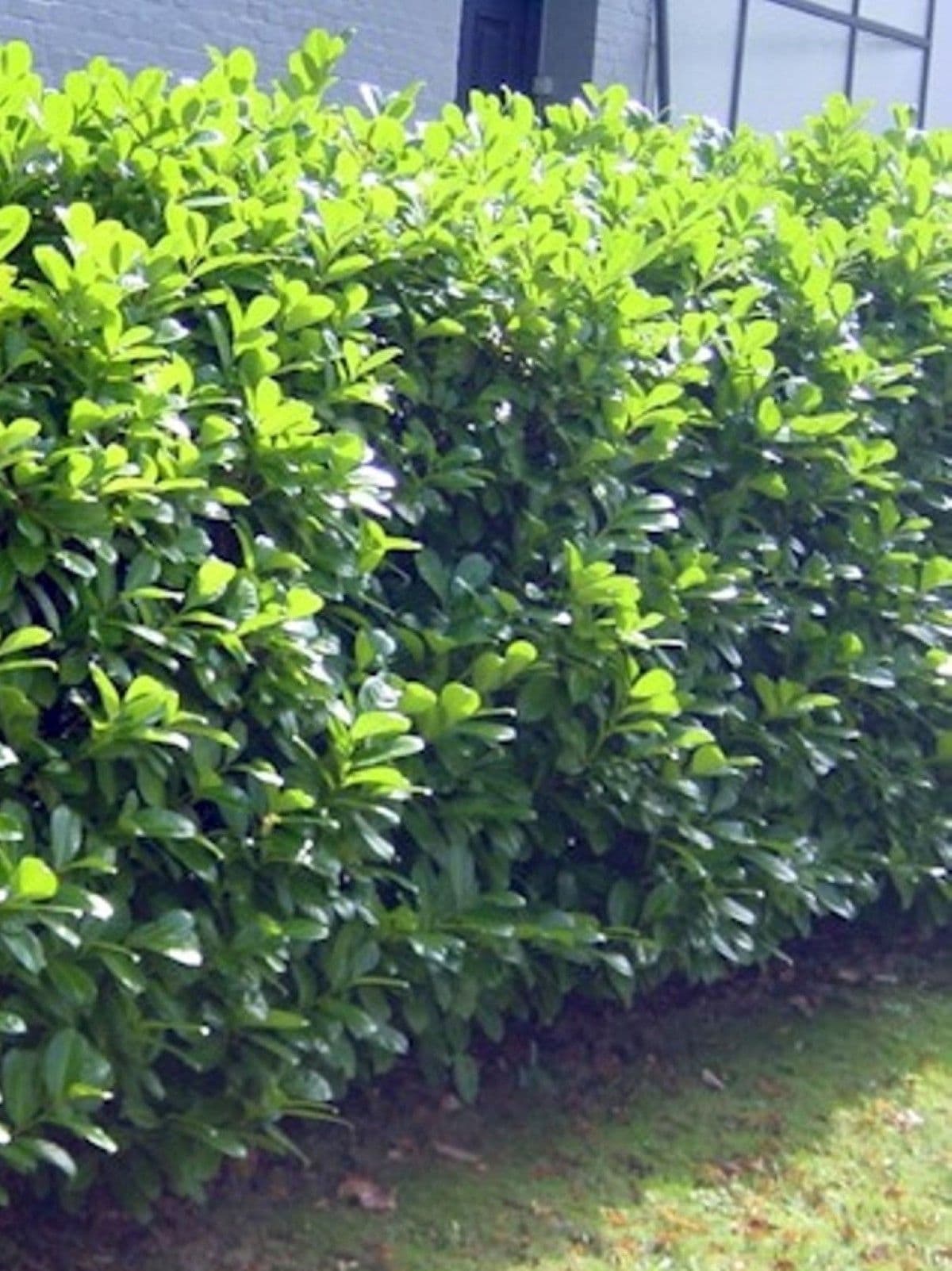 Prunus laurocerasus Rotundifolia Cherry Laurel or Common Laurel is a dense evergreen shrub with large oblong glossy mid green leaves. Produces spikes of white flowers followed by red fruits that turn black as they ripen. Will grow to up to 4-5 metres. Makes an excellent hedge to be trimmed to between 1.5 - 4 metres tall. Good in shady positions.