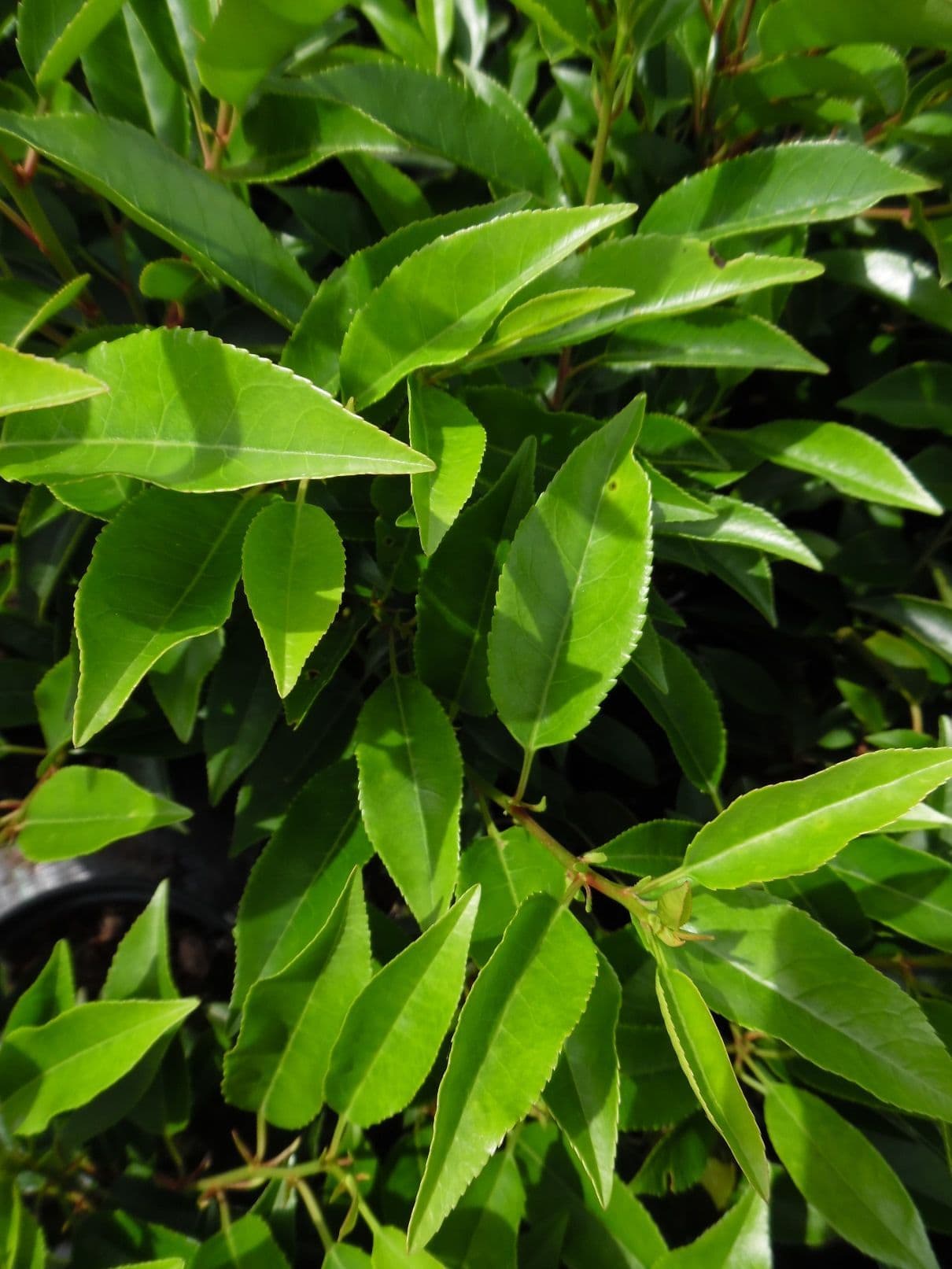Prunus lusitanica Angustifolia - Portuguese Laurel is a dense, bushy, evergreen shrub or tree with red stems and small dark green leaves. Produces fragrant white flowers in summer on untrimmed plants followed by cherry like red fruit on mature plants harmful if eaten. Ideal hedging plant and tolerant of most soil types and conditions.