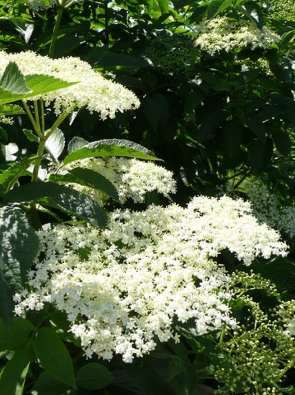 Sambucus nigra (Elder, Elderflower or Elderberry) is a vigorous native deciduous shrub. Has large flat clusters of white flowers in the summer which are followed by small black elderberries. Attracts wildlife and will grow in most soils, especially chalky sites. The flowers are use to make delicious elderflower cordial or wine. The fruit can also be used to make cordial, jelly or wine. Good in mixed hedges.