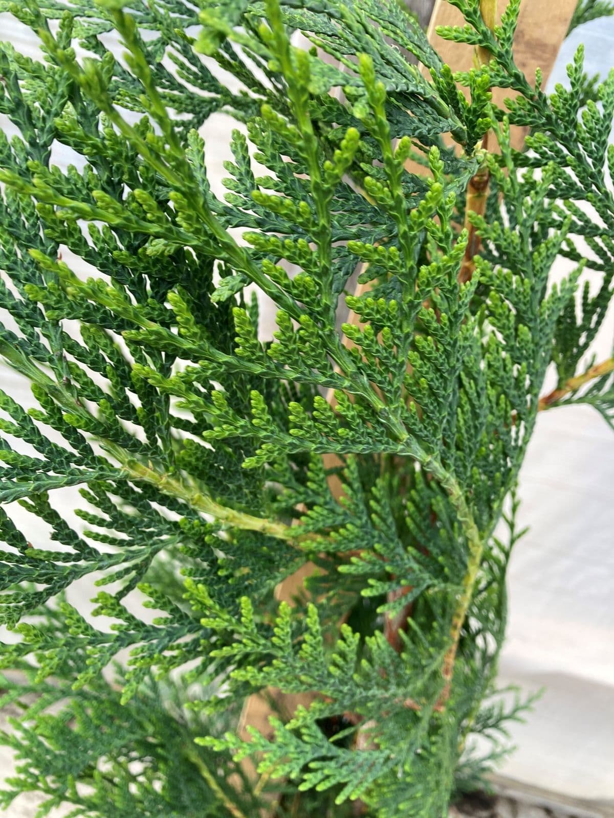 Thuja plicata Atrovirens - Western Red Cedar is a tall, conical, evergreen conifer with red-brown bark and very dark green leaves. Excellent fast growing hedging plant. Hardy.